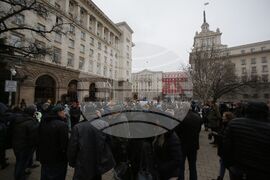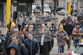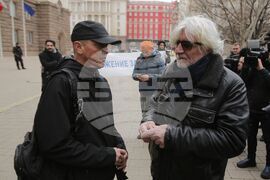 София (16 март 2023) "Движение за култура" организира шествие в столицата. Участниците в проявата настояват за адекватно законодателство за творческите институции и за оставката на директора на Народния театър "Иван Вазов" Васил Василев. На снимката: Никола Додов (вляво), Георги Стоев - Джеки (в средата) и Христо Илиев - Чарли.