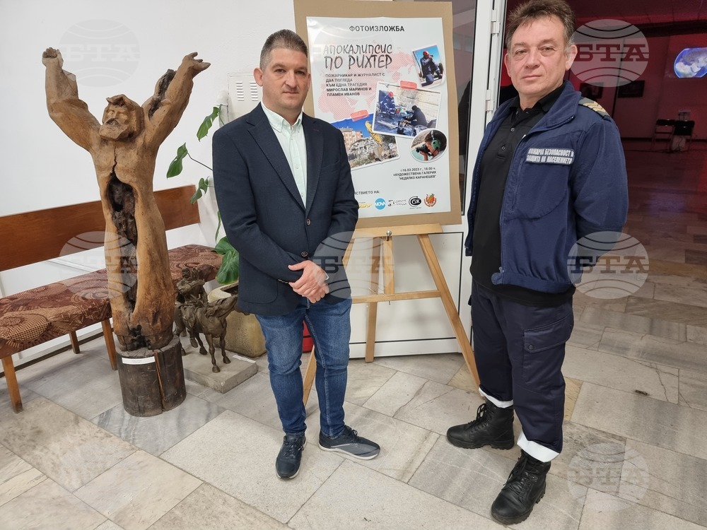 Горна Оряховица (17 март 2023) Фотоизложбата “Апокалипсис по Рихтер” показва последиците и преживяванията на пострадалите от унищожителното земетресение в Турция и Сирия. Автори на снимките, запечатали ужаса след унищожителните трусове, са видеооператорът на Нова телевизия Пламен Иванов (ляво) и инспектор Мирослав Маринов (дясно) от сектор „Специализирани оперативни дейности“ при Регионалната дирекция „Пожарна безопасност и защита на населението“ във Велико Търново. Изложбата е открита в ХГ "Недялко Каранешев".
