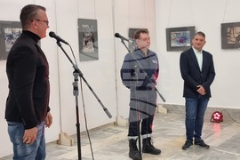 Горна Оряховица (17 март 2023) Фотоизложбата “Апокалипсис по Рихтер” показва последиците и преживяванията на пострадалите от унищожителното земетресение в Турция и Сирия. Автори на снимките, запечатали ужаса след унищожителните трусове, са видеооператорът на Нова телевизия Пламен Иванов и инспектор Мирослав Маринов от сектор „Специализирани оперативни дейности“ при Регионалната дирекция „Пожарна безопасност и защита на населението“ във Велико Търново. Изложбата е открита в ХГ "Недялко Каранешев". На снимката (от ляво надясно): журналистът от Нова телевизия Мартин Георгиев, Мирослав Маринов, Пламен Иванов.