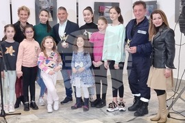 Горна Оряховица (17 март 2023) Фотоизложбата “Апокалипсис по Рихтер” показва последиците и преживяванията на пострадалите от унищожителното земетресение в Турция и Сирия. Автори на снимките, запечатали ужаса след унищожителните трусове, са видеооператорът на Нова телевизия Пламен Иванов и инспектор Мирослав Маринов от сектор „Специализирани оперативни дейности“ при Регионалната дирекция „Пожарна безопасност и защита на населението“ във Велико Търново. Изложбата е открита в ХГ "Недялко Каранешев". На снимката: авторите на изложбата и деца от Балетно студио "Грация".