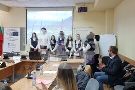 Враца (17 март 2023) Регионална среща на училищата-посланици на Европейския парламент се провежда в момента във Враца. Участват училища от Враца, Монтана, Мездра и Плевен. На снимката: учениците от Средно училище "Иван Вазов" Мездра.