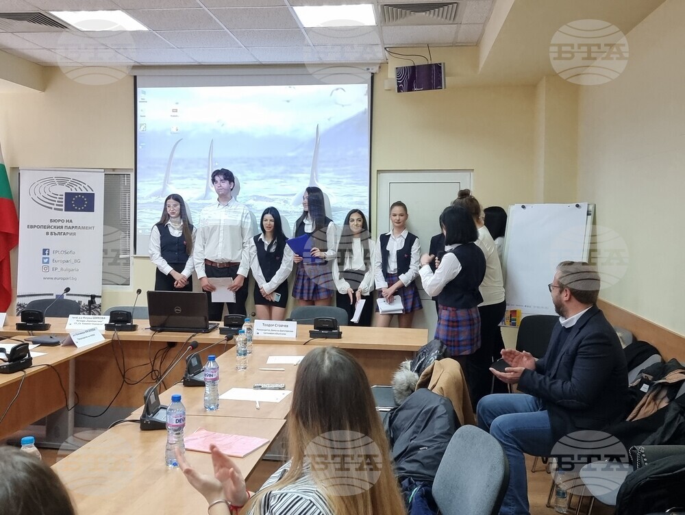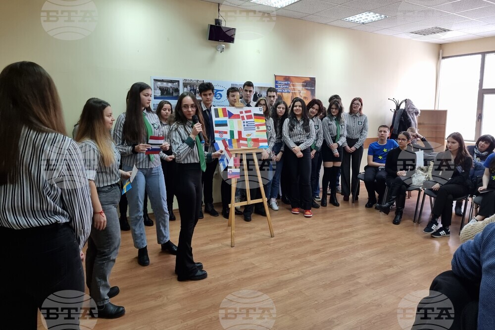 Враца (17 март 2023) Регионална среща на училищата-посланици на Европейския парламент се провежда в момента във Враца. Участват училища от Враца, Монтана, Мездра и Плевен. На снимката: учениците от Профилирана езикова гимназия "Йоан Екзарх" Враца.