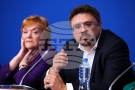 София (25 март 2023) Пресконференция по повод 90-годишнината от рождението на поета Константин Павлов се провежда в Националния пресклуб на БТА. Ще бъде представена информация за връчването на наградата за поезия „Константин Павлов“, както и за предстоящите прояви през юбилейната година. На снимката: председателят на журито проф. Михаил Неделчев, журналистът и инициатор на наградата за поезия на името на Константин Павлов Румяна Таслакова. Снимка: Минко Чернев/БТА (ЕД)