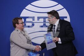 София (28 март 2023) В Националния пресклуб на БТА София се състоя пресконференция, на която бе подписан договор за медийно партньорство между Българската телеграфна агенция (БТА) и Софийската градска художествена галерия (СГХГ). На снимката (от ляво надясно): директорът на СГХГ Аделина Филева, генералният директор на БТА Кирил Вълчев.