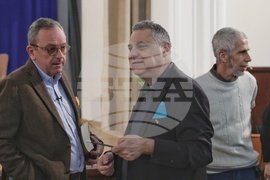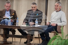 София (5 април 2023) В Българската академия на науките се провежда дискусия "Ироничният поглед към миналото". На снимката (от ляво надясно): Проф. Петър Стоянович , писателят чл.-кор. Алек Попов и проф. Николай Аретов. Снимка: Владимир Шоков/БТА (ЕД)