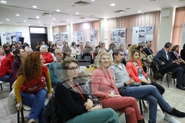 Бургас (6 април 2023) В Културен център „Морско казино", зала „Георги Баев" се провежда среща на сдружение „Каритас София". По време на събитието се обявяват целите и дейностите по проект „Протегната ръка за бежанците от Украйна". Той е финансиран по Норвежкия финансов механизъм. Основен фокус на инициативата е предоставяне на достъп до здравеопазване, образование и заетост на украинските бежанци. На снимката: представителите на хуманитарен център „Каритас София" - Бургас.