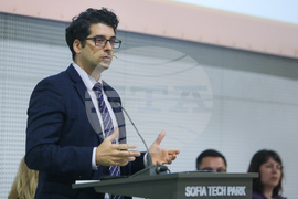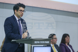 София (10 април 2023) Национална среща "Индустриални зони - растеж за общините и регионите" се провежда в София Тех парк. Форумът е организиран от Министерството на иновациите и растежа (МИР). Събитието е във връзка с предстоящо кандидатстване по една от най-важните процедури от Плана за възстановяване и устойчивост. На снимката: изпълнителният директор на Изпълнителната агенция за насърчаване на малките и средни предприятия Бойко Таков (в средата). Снимка: Цветомир Петров /БТА (ЕД)