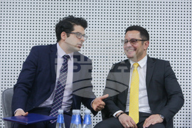София (10 април 2023) Национална среща "Индустриални зони - растеж за общините и регионите" се провежда в София Тех парк. Форумът е организиран от Министерството на иновациите и растежа (МИР). Събитието е във връзка с предстоящо кандидатстване по една от най-важните процедури от Плана за възстановяване и устойчивост. На снимката: служебният заместник министър-председател по управление на европейските средства Атанас Пеканов и служебният министър на иновациите и растежа Александър Пулев (дясно). Снимка: Цветомир Петров /БТА (ЕД)