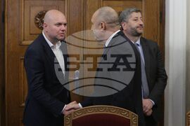 София (20 април 2023) Президентът Румен Радев провежда консултации с парламентарните сили в 49-ото Народно събрание. Държавният глава прие представители на парламентарната група на „Продължаваме промяната - Демократична България" (ПП-ДБ). На снимката от ляво надясно: съпредседателят на „Демократична България“ (ДБ) Владислав Панев, президентът Румен Радев и съпредседателят на „Демократична България“ (ДБ) Христо Иванов.