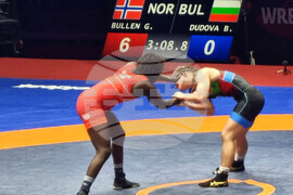 Загреб (20 април 2023) Българката Биляна Дудова (синьо трико) в схватка с норвежката Грейс Булен (червено) на полуфиналите на 62 кг от европейското първенство по борба в Хърватия.