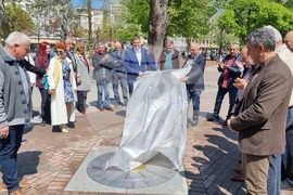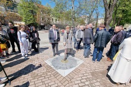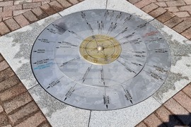 Хасково (21 април 2023) Инсталацията "Километър нула - Хасково" бе открита в градинката до сградата на общината в Хасково. Мястото е точната геодезична точка на пресичането на диагоналите от четирите страни на южния областен център. Идеята е на местния Ротари клуб Аида, чийто президент Драгомир Андонов откри инсталацията с кмета Станислав Дечев. Снимка: Николай Грудев/БТА (ЕД)
