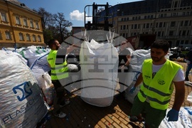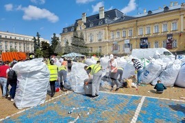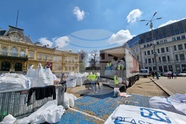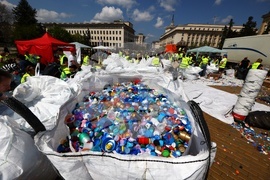 София (23 април 2023) Доброволци сортират пластмасови капачки, бутилки и алуминиеви кенчета по време на кампанията "Капачки за Бъдеще" на площад "Александър Батенберг".