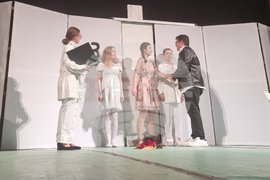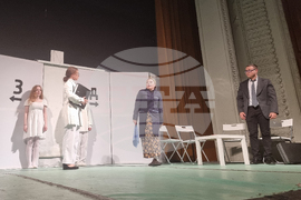 Разград (27 април 2023) Театралната трупа „Сцена на бъдещето“ към Профилираната гимназия с преподаване на чужди езици „Екзарх Йосиф“ в Разград представи най-новата си постановка "Хотел между тоя и оня свят" по текст на Ерик-Еманюел Шмит. На сцената на Народно читалище "Развитие 1869" актьорите от театралната трупа успешно пресъздадоха тъжно-веселата философия за живота и смъртта, която се съдържа в пиесата. В постановката, режисирана от единадесетокласника Виктор Маринов участваха Пламена Панова, Светлозара Иванова, Селин Алтънай, Онур Тунджай, Диляра Назиф, Елена Петрова, Ясмин Джелялова. Самият Виктор се превъплъти в образа на журналиста Жулиен Портал. Снимка: Садет Кърова/БТА (ЕД)