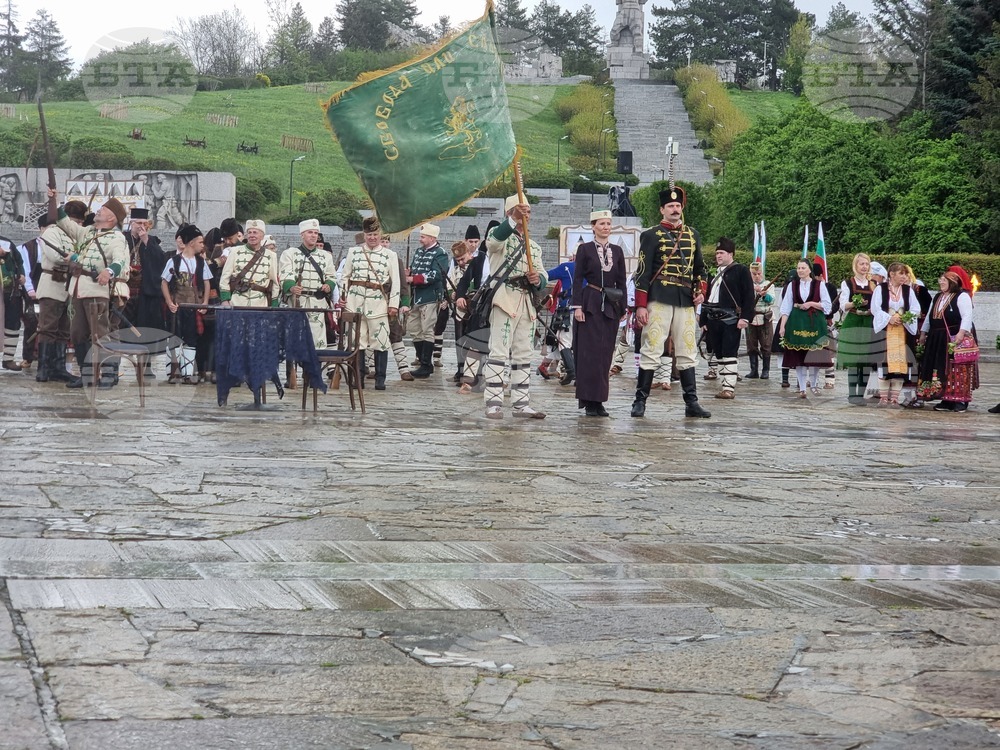 Стотици жители и гости на средногорския град въпреки дъжда се стекоха на площад "20 април" за ритуала по издигане на Националното знаме на България.
