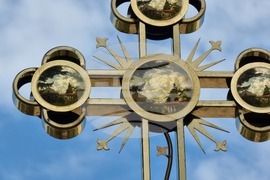 Пред „Вечния огън“ на мемориалния комплекс „Априлци“ бяха положени венци и цветя от държавни, общински и обществени институции. На снимката: кметът на Панагюрище Никола Белишки и свещеници от Панагюрската духовна околия.
