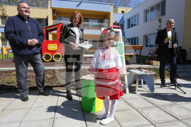 София (2 май 2023) В детска градина 88 в кв. „Дружба“, бяха предоставени контейнери за разделно събиране на отпадъци по проект на Столична община. Присъстват кметът на София Йорданка Фандъкова, зам.-кметът по екология Десислава Билева и кметът на район „Искър“ Ивайло Цеков. Снимка: Цветомир Петров/БТА (ЕД)