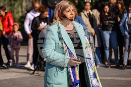 Бургас (4 май 2023) На площад "Тройката" в центъра на Бургас се провежда празнично хоро на Основно училище "Любен Каравелов". В инициативата се включват ученици и родители. На снимката: директорът на ОУ "Любен Каравелов" Пепа Марчева. Снимка: Христо Стефанов/БТА (ЕД)