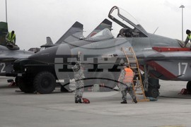 София (4 май 2016) В авиобаза Враждебна, започна подготовката на екипажите на ВВС за въздушния парад по повод Деня на Храбростта и празник на БА на Гергьовден. На снимката: Изтребител МиГ-29. Пресфото - БТА снимка: Асен Тонев (ЕД)