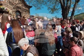 Перник (5 май 2023) Чудотворната десница на Св. Георги Победоносец пристигна в Перник. Множество миряни от областта и други градове на страната пристигнаха в най-старата действаща църква в града, носеща името на светеца. Те се поклониха пред чудодейната светиня, която ще остане в църковния храм и по време на утрешния празник - Гергьовден. Снимка: Милен Миланов /БТА (ЕД)