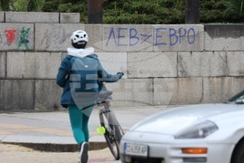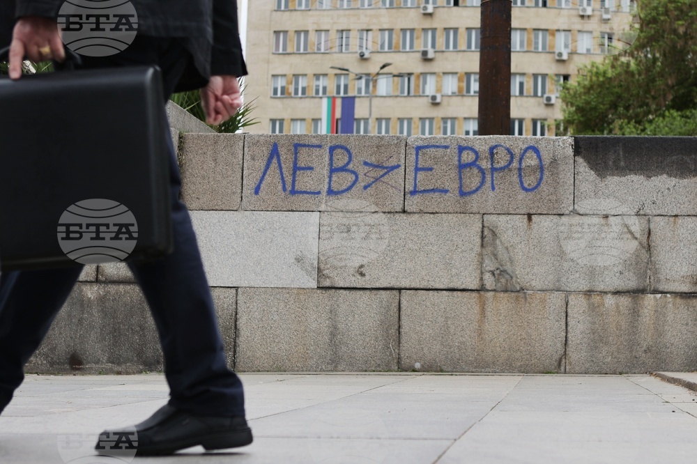 София (9 май 2023) В Деня на Европа в центъра на столицата може да бъде видян надпис на стена "ЛЕВ>ЕВРО".