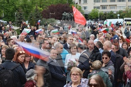 София (9 май 2023) Участници в шествието “Безсмъртен полк” се събират пред Паметника на съветската армия по повод годишнина от победата над хитлерофашизма. По същото време на паметника са и участници в инициативата “Искаме български паметник”. На място присъстват служители на жандармерията. На снимката: посланикът на Руската федерация Елеонора Митрофанова.
