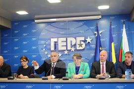 София (9 май 2023) Ръководството на ГЕРБ и Изпълнителната комисия на партията дават брифинг в централата на партията. На снимката (от ляво надясно): Томислав Дончев, председателят на ПГ на ГЕРБ - СДС Десислава Атанасова, председателят на ГЕРБ Бойко Борисов, Деница Сачева, председателят на Народното събрание Росен Желязков, Делян Добрев.