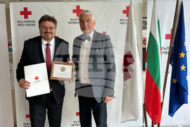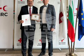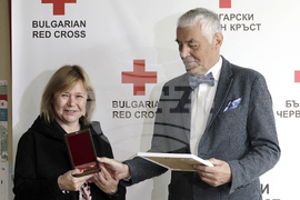 София (10 май 2023) Официална церемония по награждаването на дарители, партньори, доброволци и служители на БЧК и БМЧК със значим принос за развитието на организацията, утвърждаването на нейния авторитет и за оказаната подкрепа на червенокръстките каузи. На снимката: председателят на БЧК акад. Христо Григоров (дясно) връчи награда на генералния директор на БТА Кирил Вълчев. Снимка: БТА (ЕД)