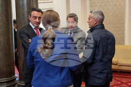 София (11 май 2023) В Народното събрание се провежда заседание на парламента. На снимката: неформални разговори в кулоарите между ГЕРБ-СДС и ПП-ДБ. На снимката (от ляво надясно): депутатът от ГЕРБ Деница Сачева, депутатите от ПП-ДБ Даниел Лорер, Христо Иванов, Андрей Гюров.