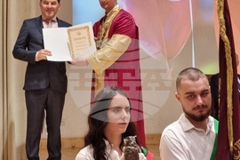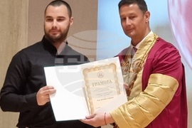Варна (15 май 2023) 103-а годишнина от основаването на Икономическия университет във Варна бе отбелязана днес в учебното заведение. Ректорът на университета проф. Евгени Станимиров връчи традиционните академични отличия "Студент на годината" и "Докторант на годината". За пръв бе връчена награда и за успешно реализиран студент на университета, която е разделена в три категории. На снимката: С "Докторант на годината" бе отличен Косьо Владимиров. Снимка: Мила Едрева/БТА (ЕД)