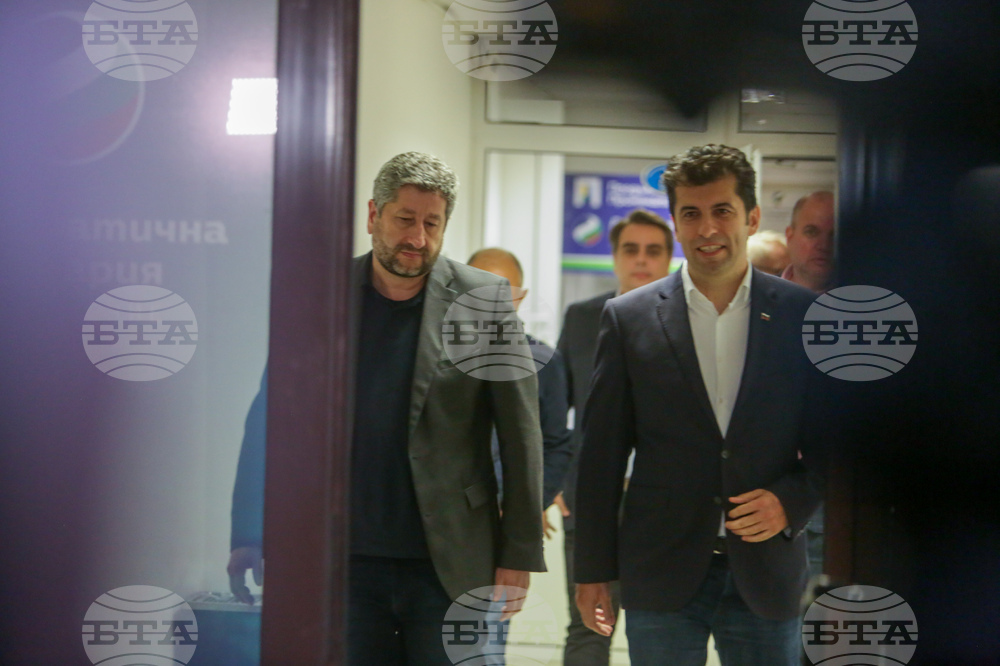 София (16 май 2023) Представители на „Продължаваме Промяната-Демократична България“ правят изявление пред медиите след проведено заседание на Национален съвет. На снимката: Христо Иванов (ляво) и Кирил Петков (дясно).