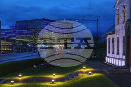 Рейкявик (17 май 2023) Исландия е домакин на четвъртата среща на върха на държавните и правителствените ръководители на Съвета на Европа. През втория ден се провежда общ дебат на тема: "Обединени за Европа". На снимката: Сградата, в която се провежда форумът концертната зала и конферентен център "Harpa" е оцветена в цветовете на знамето на Украйна - синьо и жълто. Снимка: Владимир Шоков/БТА (ЕД)