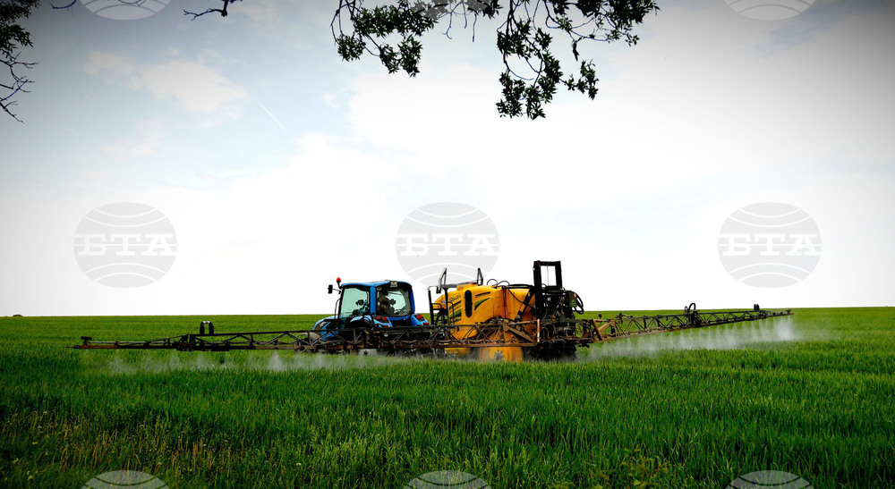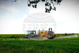 Разград (18 май 2023) Земеделски стопани извършват пролетно подхранване с хербициди на масив с пшеница край града.