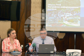 Русе (22 май 2023) Първите публично достъпни слоеве от географската информационна система на Община Русе се представя на пресконференция днес от кметския екип на дунавския град. На снимката (от ляво надясно): заместник-кметът "Икономика и международно сътрудничество" Златомира Стефанова, н-к. отдел Информационна техника Николай Кутинчев.