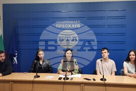 Плевен (22 май 2023) В Националния пресклуб на БТА в Плевен се провежда пресконференция по повод приключен проект на Сдружение „Рицари без броня". Младежите са ученици в Държавна финансово-стопанска гимназия „Интелект" и са включени след проведен конкурс за есе в проекта „Бъди активен - от теб зависи промяната“, реализиран по програма Еразъм+. Участват (от ляво надясно) менторът Йордан Грижов, участникът Мария Дамянова, координаторът Цветелина Грижова, участници в дейностите Никола Петров и Николия Стоянова.