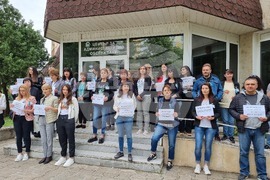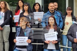Ловеч (25 май 2023) Служители на Териториалното поделение на Националния осигурителен институт (ТП на НОИ) в Ловеч излязоха на едночасова ефективна предупредителна стачка пред сградата на институцията в града. Искането им е за не по-малко от 30 процента увеличение на средствата за работни заплати в системата на НОИ, което да влезе в сила от 1 януари 2023 г. Снимка: Даниела Балабанова/БТА