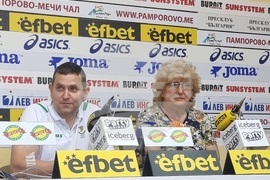 София (2 август 2023) В Пресклуб България федерацията по Фехтовка и Йоана Илиева дават пресконференция на след спечеления от нея бронзов медал на Световното първенство. На снимката : треньорът Ивайло Воденов и президентът на федерацията по фехтовка Величка Христева.