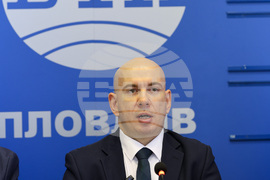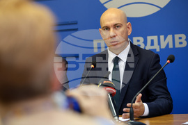 Пловдив (4 август 2023) Ангел Георгиев е кандидатът за кмет на Пловдив на ПП "Възраждане". Това съобщиха на пресконференция в Националния пресклуб на БТА в Пловдив от местното ръководство партията. На снимката: народеният представител в 49-ото НС и председател на структурата на партията в Пловдив Емил Янков. Снимка: Боян Ботев/БТА(ЕД)
