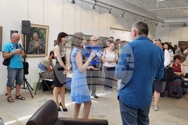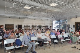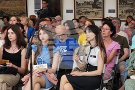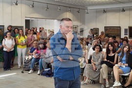 Самоков (5 август 2023) В Художествена галерия "Проф. Васил Захариев" в Самоков се провежда среща разговор с писателя на престижната награда "Букър" Георги Господинов. Пълната зала събра журналисти, културни дейци и медийни представители. На снимката: директорът на Исторически музей Самоков Веселин Хаджиангелов (в средата).