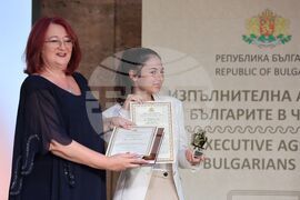 София (7 август 2023) На тържествена церемония в столицата деца от българските общности в чужбина получават награди от три творчески конкурса, обявени от Изпълнителната агенция за българите в чужбина (ИАБЧ). Учениците се награждават след участие в литературен конкурс „Стефан Гечев“, конкурс по рисуване „България в моите мечти“ и творческо състезание по пеене „Любка Рондова“. Домакин на церемонията е Националният дворец на децата. На снимката: изпълнителният директор на Изпълнителната агенция за българите в чужбина Райна Манджукова и Алина Константинова (дясно).