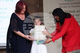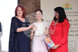 София (7 август 2023) На тържествена церемония в столицата деца от българските общности в чужбина получават награди от три творчески конкурса, обявени от Изпълнителната агенция за българите в чужбина (ИАБЧ). Учениците се награждават след участие в литературен конкурс „Стефан Гечев“, конкурс по рисуване „България в моите мечти“ и творческо състезание по пеене „Любка Рондова“. Домакин на церемонията е Националният дворец на децата. На снимката: изпълнителният директор на Изпълнителната агенция за българите в чужбина Райна Манджукова и Валерия Будаи.