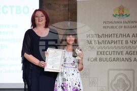 София (7 август 2023) На тържествена церемония в столицата деца от българските общности в чужбина получават награди от три творчески конкурса, обявени от Изпълнителната агенция за българите в чужбина (ИАБЧ). Учениците се награждават след участие в литературен конкурс „Стефан Гечев“, конкурс по рисуване „България в моите мечти“ и творческо състезание по пеене „Любка Рондова“. Домакин на церемонията е Националният дворец на децата. На снимката: изпълнителният директор на Изпълнителната агенция за българите в чужбина Райна Манджукова и Екатерина Баркова (ляво).