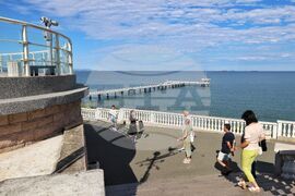 Бургас (8 август 2023) Поглед към морската тераса, известна още като балюстрадата, в Морската градина. Любимо място за среща на жителите и гостите на града заради впечатляващата гледка към залива и моста. От терасата тръгва влакчето, което прави обиколка на Морската градина. Снимка: Христо Стефанов/БТА (EД)