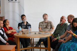 Банско (11 август 2023) В читалище „Никола Вапцаров“ в Банско се провежда пресконференция на участниците в заключителния концерт на Банско джаз фестивал 2023 г. На снимката (от ляво надясно): Петър Георгиев, Десислава Андонова, Димитър Карамфилов, Еспен Ериксен, Анди Шепърд, Ларс Йенсен.