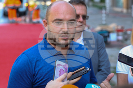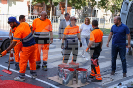 София (18 август 2023) Председателят на Столичния общински съвет Георги Георгиев (ляво) и зам.-кметът Дончо Барбалов (дясно) представят нов тип пътна настилка за намаляване на скоростта.
