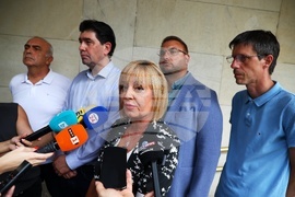 София (22 август 2023) Изявления на представители на „ЛЕВИЦАТА!“ и градската организация на БСП-София след проведена среща с министъра на вътрешните работи Калин Стоянов по повод притеснения за подготвяни нови провокации и нападение над палатковия лагер и Паметника на Съветската армия в четвъртък. На снимката: Мая Манолова.