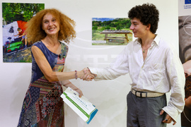 София (23 август 2023) Церемония по награждаване на участниците в националния конкурс „Арт-циклиране" се провежда в галерия „Порт А". Организатор е информационна инициатива „Обща селскостопанска политика: Говори науката", изпълнявана от „Агенция Стратегма" ООД с подкрепата на Генерална дирекция „Земеделие и развитие на селските райони" на Европейската комисия. Две от работите получиха равни точки и така победителите в конкурса са двама. Самуел Папаро и Благой Котев, село Илинденци с произведението „Музикална пътека от рециклирани материали“ спечелиха първо място и наградата „Любимец на публиката“. На снимката: Тихомира Трифонова връчва наградите на Самуел Папаро.