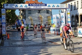 Троян (27 август 2023) Италианецът Микеле Гацоли от отбора на Астана спечели втория полуетап от Пирдоп до Троян в 70-ата международна колоездачна обиколка на България. Втори финишира Томас Якубек, а трети се класира Феликс Стехли. Купата на Гацоли връчи кметът на община Троян Донка Михайлова. На снимката: главният експерт "Младежки дейности и спорт" в Община Троян Тодор Комитов (ляво) връчи зелената фланелка за най-активен състезател на унгареца Жолт Истлщекер (втори отдясно).