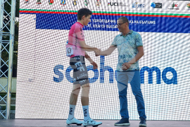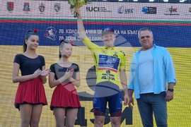 Троян (27 август 2023) Италианецът Микеле Гацоли от отбора на Астана спечели втория полуетап от Пирдоп до Троян в 70-ата международна колоездачна обиколка на България. Втори финишира Томас Якубек, а трети се класира Феликс Стехли. Купата на Гацоли връчи кметът на община Троян Донка Михайлова. На снимката: заместник-кметът на община Троян Ангел Ангелов (дясно) връчи бялата фланелка на Лука Жени (ляво).