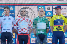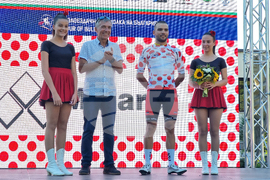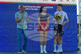 Троян (27 август 2023) Италианецът Микеле Гацоли от отбора на Астана спечели втория полуетап от Пирдоп до Троян в 70-ата международна колоездачна обиколка на България. Втори финишира Томас Якубек, а трети се класира Феликс Стехли. Купата на Гацоли връчи кметът на община Троян Донка Михайлова. На снимката: председателят на Българската федерация по колоездене Драгомир Кузов (втори отляво) връчи бялата фланелка на червени точки на Йордан Петров (втори отдясно) за най-добър катерач.