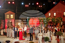 Сандански (27 август 2023) Трийсет и първото издание на "Пирин Фолк" в Сандански събра в три вечери млади таланти, любими изпълнители и повече от 100 танцьори. На снимката: президентът Румен Радев (в средата) присъства на тазгодишното 31-о поред издание на международния фестивал „Пирин Фолк“.